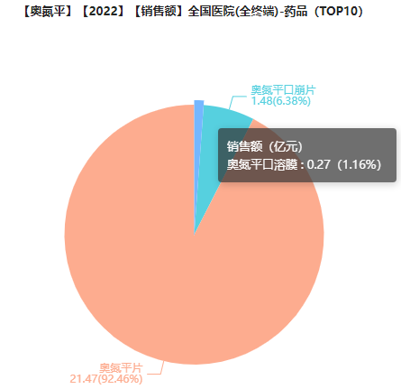 2021年奥氮平口溶膜在奥氮平产品医院端市场中的占比为0.12%,2022年实现大幅增长,以2718.50万元的销售额占比1.16%的市场份额,或将打破奥氮平各产品在医院端的竞争格局。