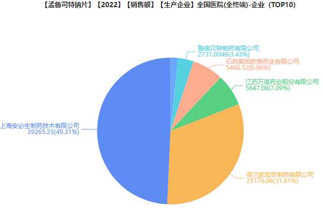 齐鲁制药的孟鲁司特钠口溶膜,2022年在医院端市场的销售额为1354.67万元,占比孟鲁司特钠产品在医院端0.61%的市场份额。孟鲁司特钠口溶膜不需要用水送服,入口后无需咀嚼及吞咽,大大减少了患儿不配合服药的现象。孟鲁司特钠药用安全性高、剂型种类多,依从度高且受众群体广,市场还未高度饱和,仍有增长空间。