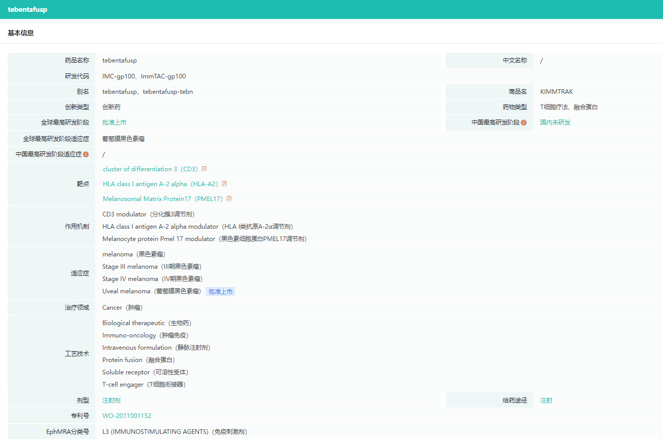 KIMMTRAK于2022年1月26日获得FDA批准上市,治疗特定的葡萄膜黑色素瘤,这是全球首款获得监管批准的T细胞受体 (TCR) 疗法,也是FDA批准的首款治疗不可切除或转移性葡萄膜黑色素瘤的疗法以及首款获FDA批准的治疗实体肿瘤的双特异性T细胞接头。目前,KIMMTRAK已在全球超35个国家获得批准,美国定价为40万美元/年。