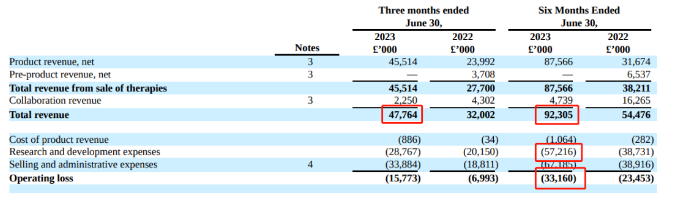 8月10日,Immunocore发布2023上半年业绩:营收 9231万英镑(1.17亿美元),同比大增70%;研发费用5722万英镑,同比增长48%;净利润亏损3316万英镑。其中Q2营收4776万英镑(6070万美元),同比增长49%。