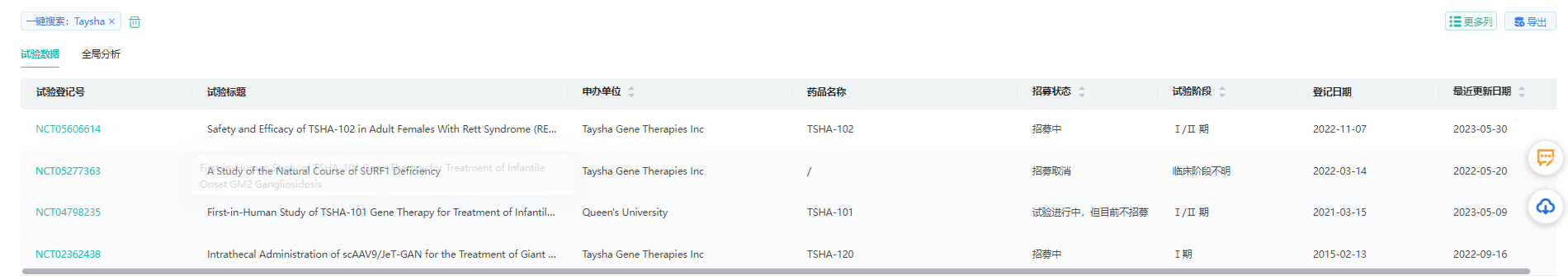 药融云数据库关于Taysha临床试验情况