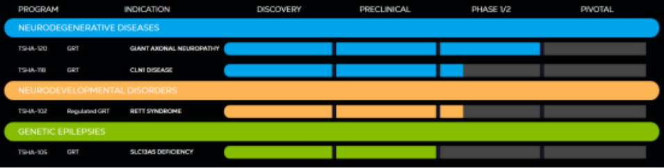 TSHA-102:一种自体补充鞘内递送AAV9基因转移疗法用于Rett综合征的临床评估,TSHA-102利用一种新型的miRARE平台,旨在介导CNS中每个细胞的MECP2水平,而不会有过表达的风险。TSHA-102已获得FDA的孤儿药和罕见儿科疾病指定,并已获得欧盟委员会的孤儿药指定。