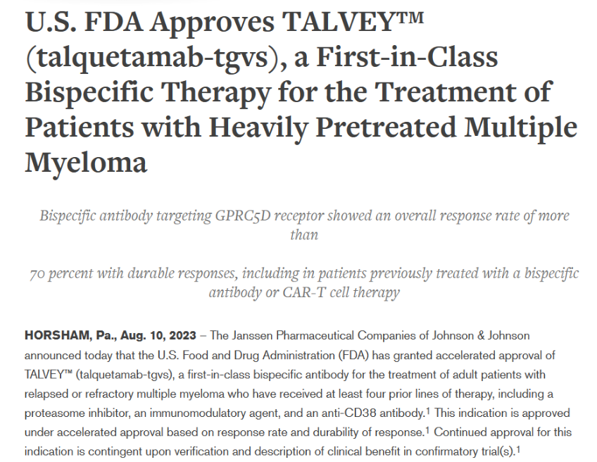 近期,强生旗下杨森(Janssen)公司宣布,美国FDA已加速批准Talvey(talquetamab-tgvs)用于治疗复发性或难治性多发性骨髓瘤成人患者。这些患者此前至少接受过四种疗法,包括蛋白酶体抑制剂、免疫调节剂和CD38抗体。
