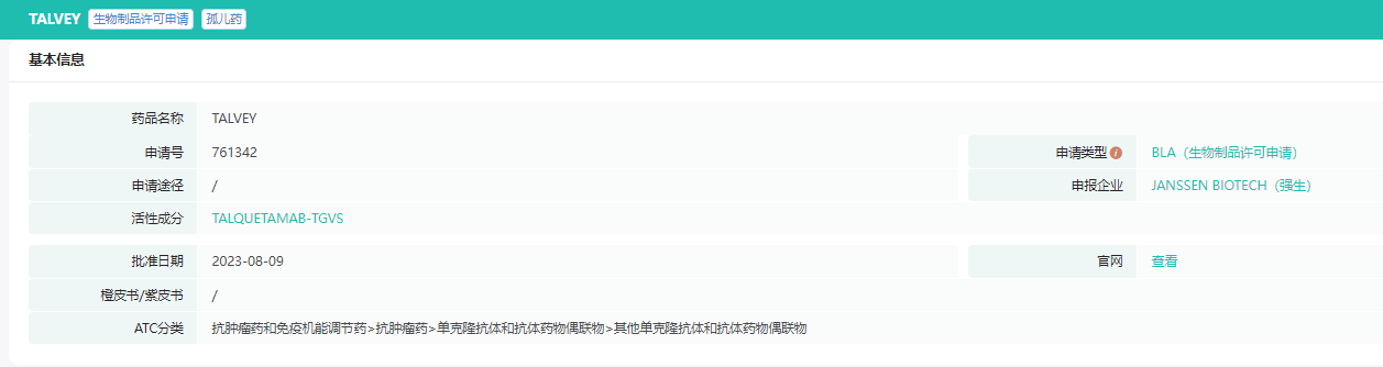 Talvey是一款GPRC5D/CD3双特异性T细胞结合抗体,可结合T细胞表面表达的CD3受体和G蛋白偶联受体家族C组5成员D(GPRC5D)。GPRC5D在正常人体组织中表达有限,但在恶性浆细胞上高表达,使其成为多发性骨髓瘤(MM)患者的有希望的免疫治疗靶点。