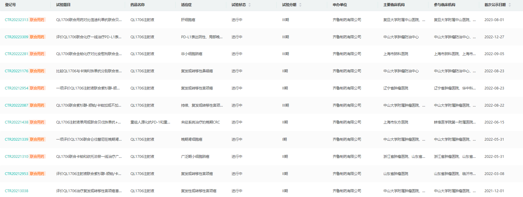 目前,QL1706已开展了多项III期临床研究,包括宫颈癌一线治疗、非小细胞肺癌的辅助治疗、晚期非小细胞肺癌的一线治疗和鼻咽癌的一线治疗等。