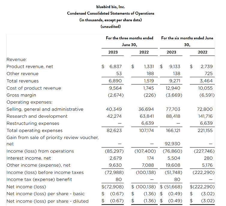 近日,蓝鸟生物公布2023年中报:上半年公司营收927.1万美元(6,684万人民币,按最新汇率1 美元 =7.21 人民币计算),同比增长167.6%;其中产品收入同比增长233%,达到913万美元(6,582万人民币)。而研发费用支出为8842万美元(6.37亿人民币),同比下降38%。现金及现金等价物2.45亿美元(17.66亿人民币)。