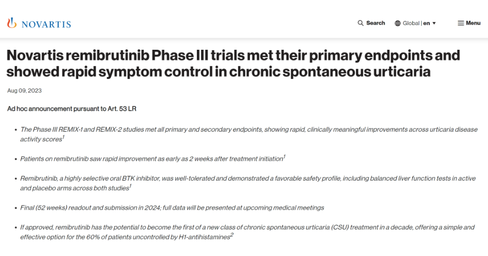 据药融云数据库显示:2023年8月9日,诺华宣布REMIX-1(临床登记号:NCT05030311)和REMIX-2(临床登记号:NCT05032157)III期临床研究取得了阳性结果。这些研究在H1抗组胺药未充分控制症状的慢性自发性荨麻疹(CSU)患者中开展,对remibrutinib 25 mg b.i.d.(每日2次)的有效性和安全性进行了评估。