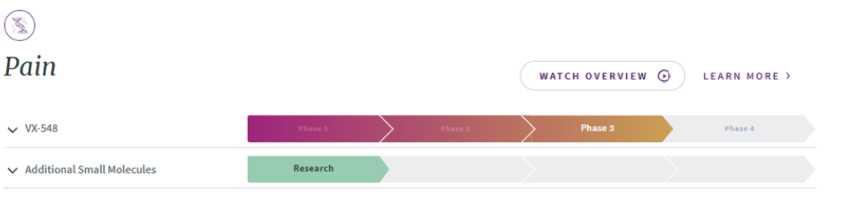 与其整体战略相一致,顶点对所有项目均采用组合方法,并通过疼痛研究和早期开发阶段推进其他 NaV1.8 抑制剂和NaV1.7 抑制剂。