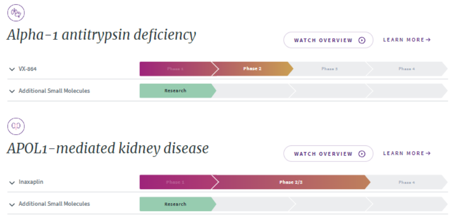 Vertex公司正致力于通过开发Z-AAT蛋白折叠的新型小分子校正剂来解决α-1抗胰蛋白酶 (AAT) 缺乏症的根本遗传原因,其目标是增加功能性AAT向血液中的分泌,同时解决AAT缺乏症的肺和肝脏两个方面。Vertex公司将在inaxaplin的关键项目中继续招募患者,这是一项针对APOL1 导致的肾脏疾病(AMKD)患者的2/3期临床试验,预计将于2023年完成2B期的剂量范围研究。此外,Vertex 公司还在推进肌营养不良症的临床前资产,包括杜氏肌营养不良症(DMD)和强直性肌营养不良症1 型(DM1)。