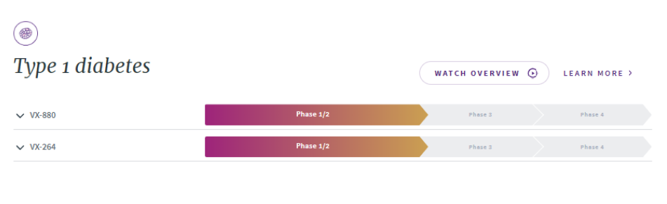 Vertex公司正在评估细胞疗法,使用干细胞衍生的、完全分化的、产生胰岛素的胰岛细胞来替代 T1D 患者中被破坏的内源性产生胰岛素的胰岛细胞,目标是开发一种潜在的功能性疗法来治疗这种疾病。