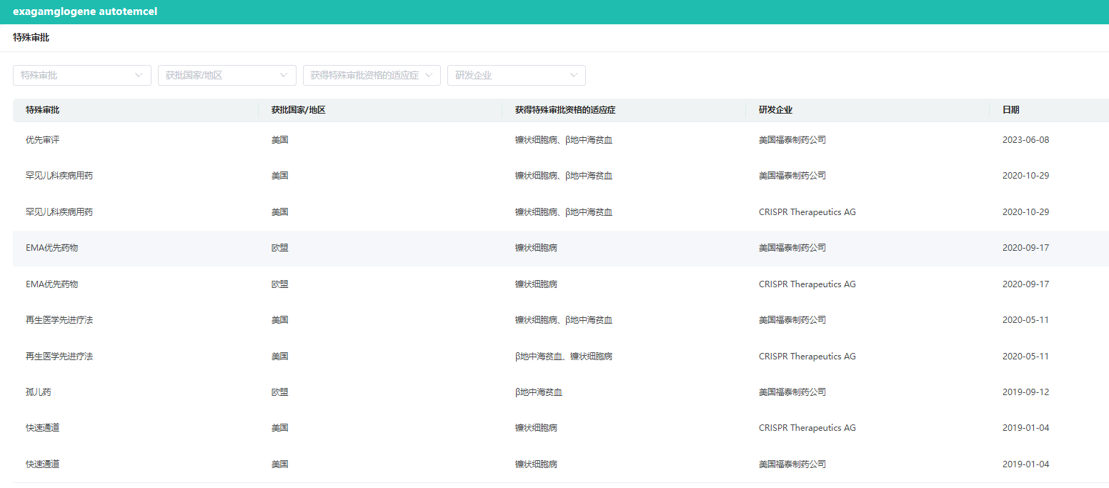 FDA接受了exa-cel的生物制品许可申请(BLA),并指定2023年12月8日为SCD的处方药用户费法(PDUFA)行动日期,2024年3月30日为TDT的PDUFA目标行动日期。Exa-cel的SCD BLA获得了FDA的优先审查。在美国,exa-cel已被授予快速通道、再生医学高级疗法 (RMAT)、孤儿药和罕见儿科疾病称号。