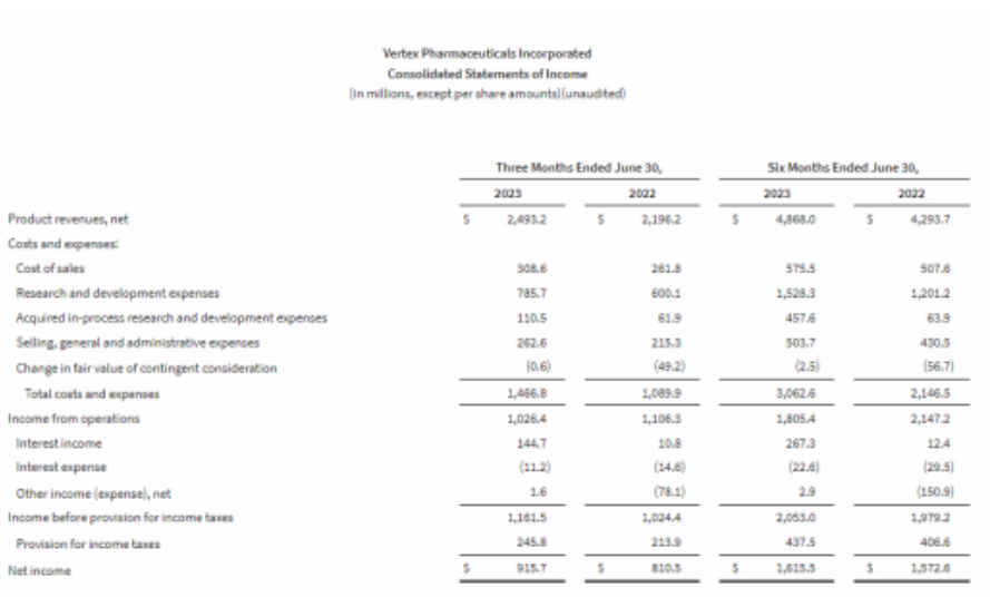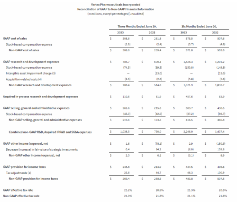 与2022年第二季度相比,GAAP和Non-GAAP的净收入分别增长了13%和9%。主要是由于强劲的收入增长和利息收入的增加部分抵消了中期和后期临床管道投资的增加,收购的知识产权和研发费用的增加,以及在全球范围内支持Vertex疗法的费用。