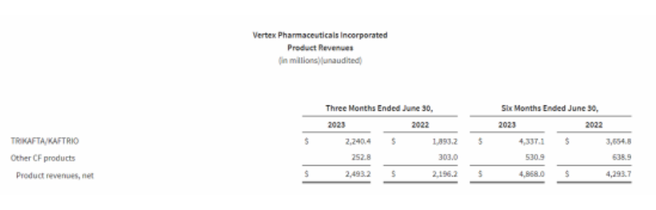 与2022年第二季度相比,产品收入增长14%,达到24.9亿美元,这主要得益于TRIKAFTA/KAFTRIO在全球多个国家独占鳌头,TRIKAFTA在2至5岁的囊性纤维化(CF)患儿中的上市成绩斐然。与2022年第二季度相比,2023年第二季美国净产品收入增长7%,达到15.1亿美元,美国以外地区增长26%,达到9.85亿美元。