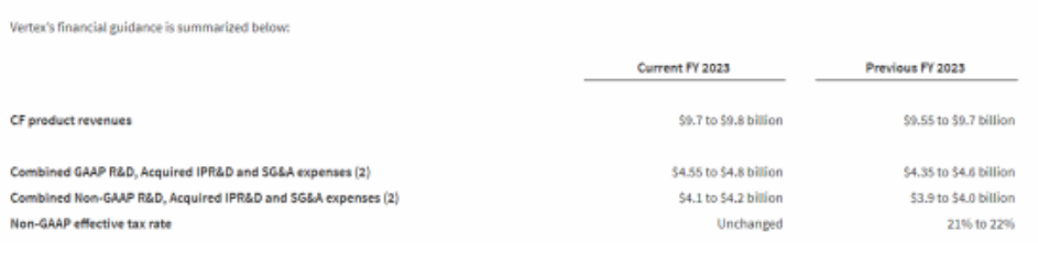 Vertex公司将2023年全年CF产品收入指导从95.5 亿美元至97 亿美元上调至97 亿美元至98 亿美元,这一增长反映了TRIKAFTA / KAFTRIO在国际上多个国家的强劲业绩和TRIKAFTA在美国的持续表现的预期全年影响。这一指导包括外汇汇率变动带来的约150 个基点的负面影响。此外,Vertex公司还提高了2023年全年的GAAP和Non-GAAP研发、收购的IPR&D和SG&A费用指导。增加的原因是今年迄今为止发生的收购知识产权研发费用增加,其中包括向CRISPR Therapeutics支付的7000万美元里程碑式付款。