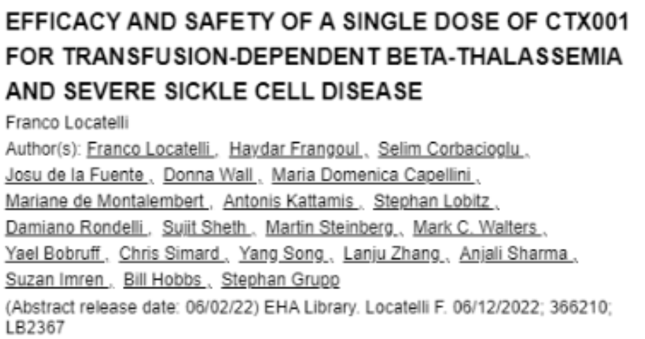 在今年6月举行的2023年欧洲血液学协会(EHA)年会上,Vertex公司公布了exa-cel治疗 SCD和TDT关键试验的积极中期结果,截止日期为2022年9月。这两项试验都在预先指定的中期分析中达到了主要终点和关键次要终点,数据继续显示出变革性、一致性和持久性的益处。Vertex 预计将在未来的医学大会上展示作为FDA申报基础的最新临床数据。