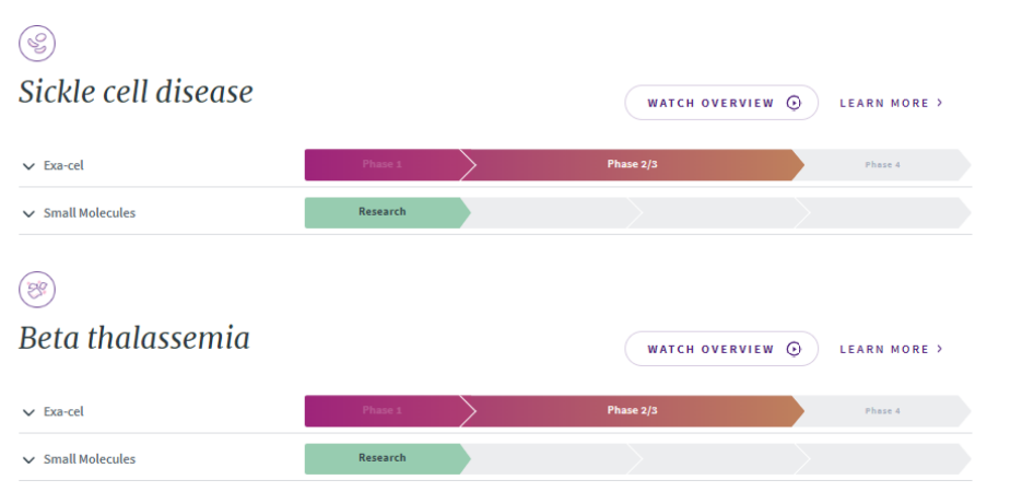 Exa-cel是一种研究性、自体、体外CRISPR/Cas9基因编辑疗法,通过编辑患者自身的造血干细胞,使得患者血红细胞可以产生高水平的胎儿血红蛋白(HbF),以治疗TDT和SCD。目前正在与CRISPR Therapeutics合作开发该药物,有望成为治疗SCD和 TDT的功能性疗法。
