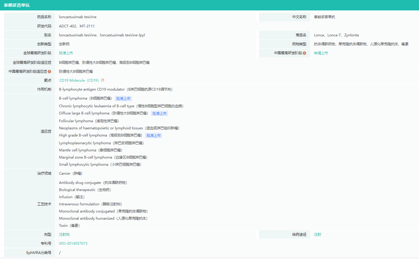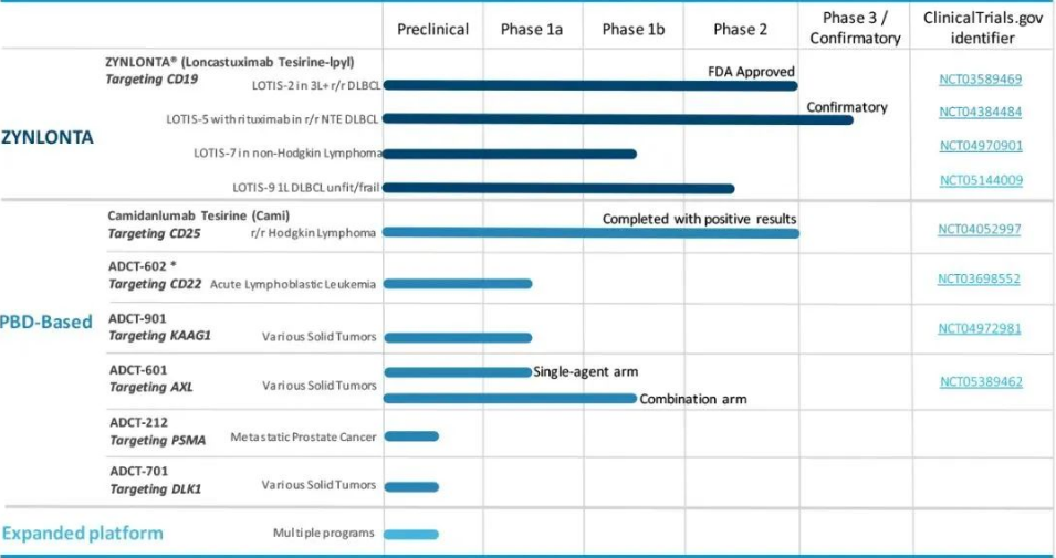 ADC Therapeutics公司的CD19导向型ADC ZYNLONTA(loncastuximab tesirine-lpyl)已被美国食品和药物管理局批准用于治疗经过两线或多线系统治疗后的复发或难治性弥漫性大B细胞淋巴瘤。ZYNLONTA也在与其他药物联合开发中。除ZYNLONTA外,ADC Therapeutics公司还有多种ADC正在进行临床和临床前开发。