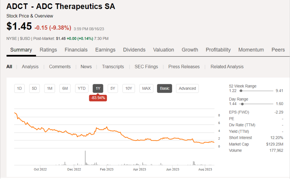 ADC Therapeutics(ADCT.N)于2020年5月15日上市,上市首日,ADC开盘大涨,收盘价为每股29.65美元。自2011年成立以来,该公司一直处于亏损状态,且逐年扩大。近一年ADC Therapeutics市值蒸发近84%,目前每股仅1.45美元,市值为1.29亿美元。