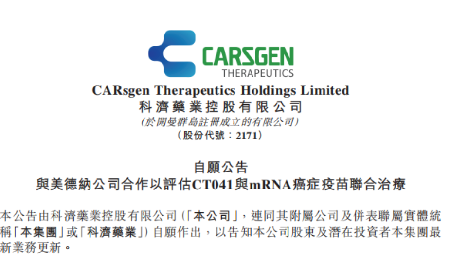 2023年8月21日,科济药业发布公告,与美德纳(“Moderna”)公司已启动了一项合作协议,以研究科济药业的Claudin18.2 CAR-T候选产品(CT041)与美德纳的试验性Claudin18.2 mRNA癌症疫苗的组合效果。