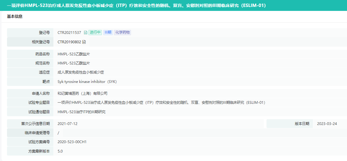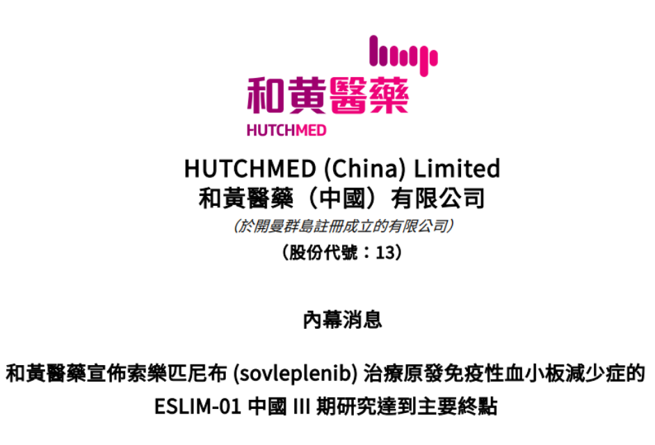 近日,和黄医药发布公告,其Syk抑制剂索乐匹尼布探索用于治疗成人原发免疫性血小板减少症(ITP)的中国关键性3期研究ESLIM-01已达到持续应答率这一主要终点以及所有的次要终点。和黄医药计划于2023年年底左右提交新药上市申请。