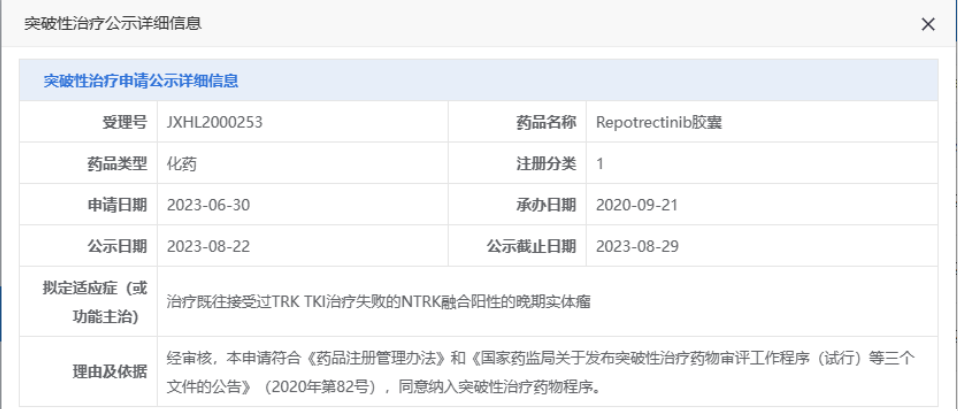 此前Repotrectinib已在中国递交新药上市申请(受理号:JXHS2300056),适用于治疗ROS1阳性的局部晚期或转移性非小细胞肺癌成人患者,该申请已被纳入优先审评审批程序。