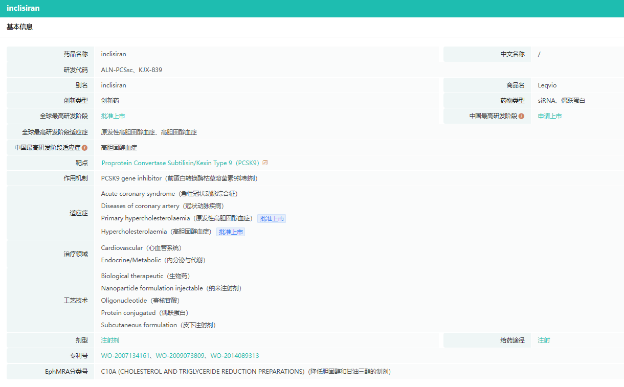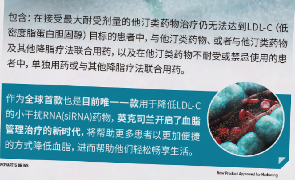 8月22日,诺华宣布,旗下小干扰RNA(siRNA)疗法英克司兰钠注射液(乐可为Leqvio,Inclisiran)获国家药监局批准上市,作为饮食的辅助疗法,用于成人原发性高胆固醇血症(杂合子型家族性和非家族性)或混合型血脂异常患者的治疗。