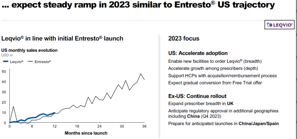 2023年上半年,Inclisiran上半年销量增长了近3倍(+293%),达到1.42亿美元(10.36亿人民币)。从放量速度来看,据诺华评估,Inclisiran 与沙库巴曲+缬沙坦(Entresto)放量速度基本一致,而后者 2022 全年销售额已达 46.44 亿美元,有望成为诺华的下一个核心增长点,市场潜力无限。
