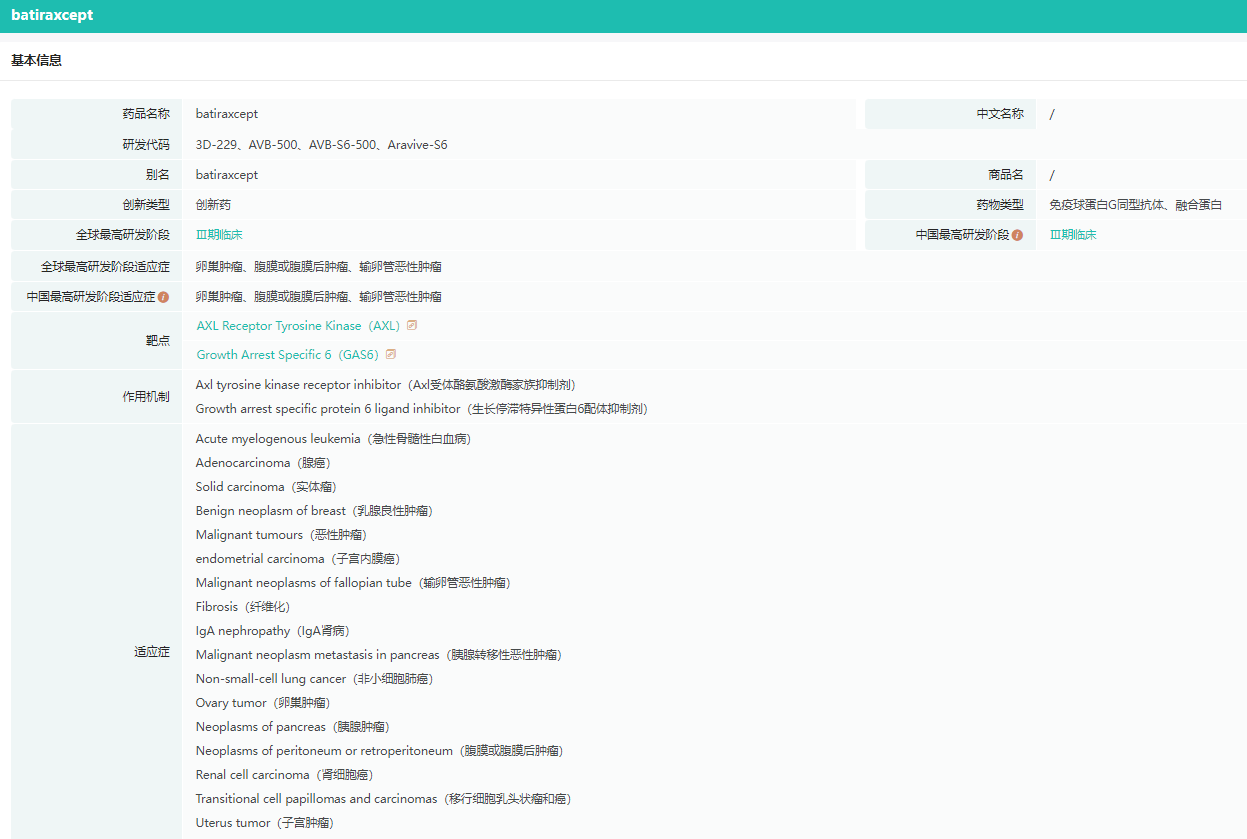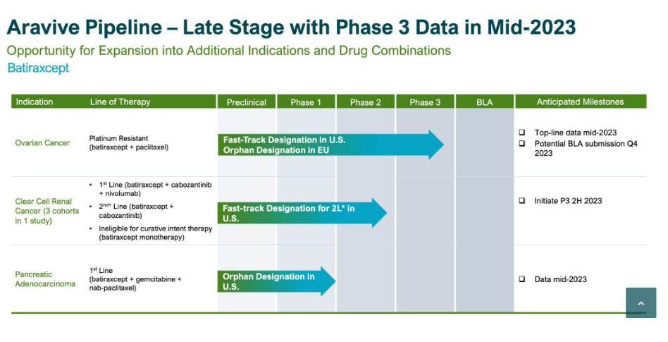 今年8月2日,Aravive宣布其评估Batiraxcept在先前未接受贝伐珠单抗治疗的铂类耐药卵巢癌患者亚群中的安全性和有效性的III 期AXLerate-OC试验未达到其主要终点无进展生存期(PFS)。该试验未显示两组在总体人群(包括先前接受贝伐珠单抗治疗的患者)中有任何差异。