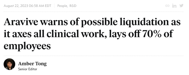 Aravive在10-Q文件中写道:“如果公司在未来几周内不能筹集资金或成功找到战略合作伙伴,它将被迫停止运营,清算资产,并可能寻求破产保护或参与类似的程序。”