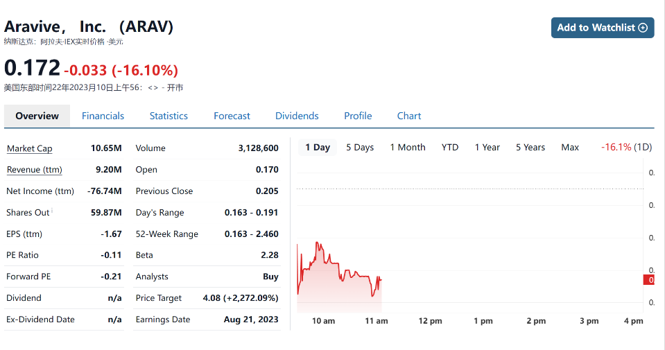 受裁员和项目关闭的影响,Aravive股价开盘下跌超16%,目前市值1065万美元。根据公司最新的ARAV季度报告显示,公司的营运资金780万美元,现金和现金等价物1840万美元。