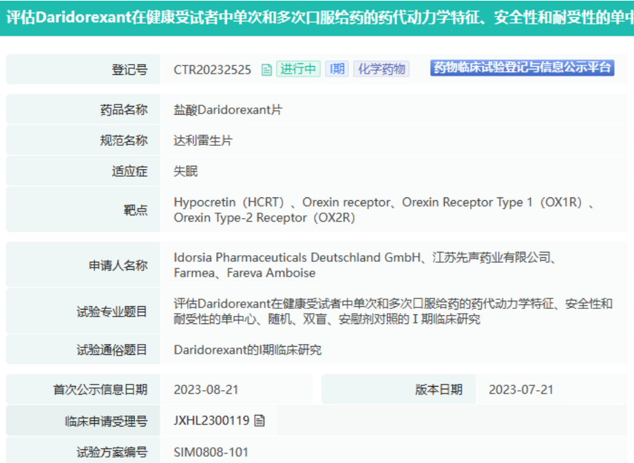 2022年11月15日,先声药业与Idorsia订立独家授权协议,获得授Daridorexant在大中华地区的开发及商业化的独家权利。Idorsia公司将获得3000万美元的首付款,并有资格在中国注册获批后获得2000万美元额外里程碑付款等。2023年7月,该药在国内获批临床,拟用于治疗症状持续存在至少3个月且对日间功能产生影响的成人失眠患者。