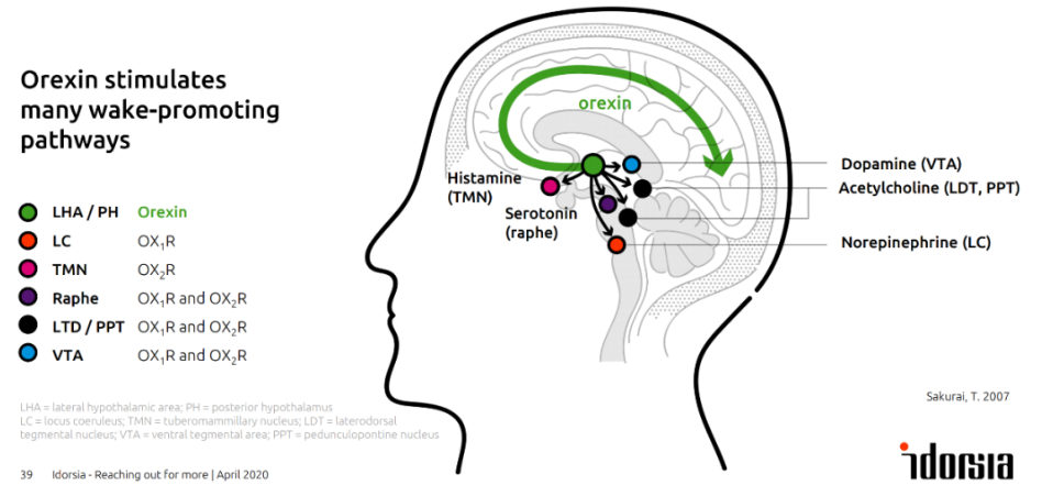Daridorexant是一种双重食欲素受体拮抗剂(DORA),可阻断促进觉醒的食欲素神经肽(食欲素A和食欲素B)与其受体结合,与与传统失眠药物(如苯二氮䓬类药物)通过镇静大脑来促进睡眠不同,Daridorexant仅阻断食欲素神经肽对食欲素受体的激活。因此,Daridorexant减少唤醒驱动,诱导睡眠发生,而不改变睡眠结构,且没有次日残留效应。
