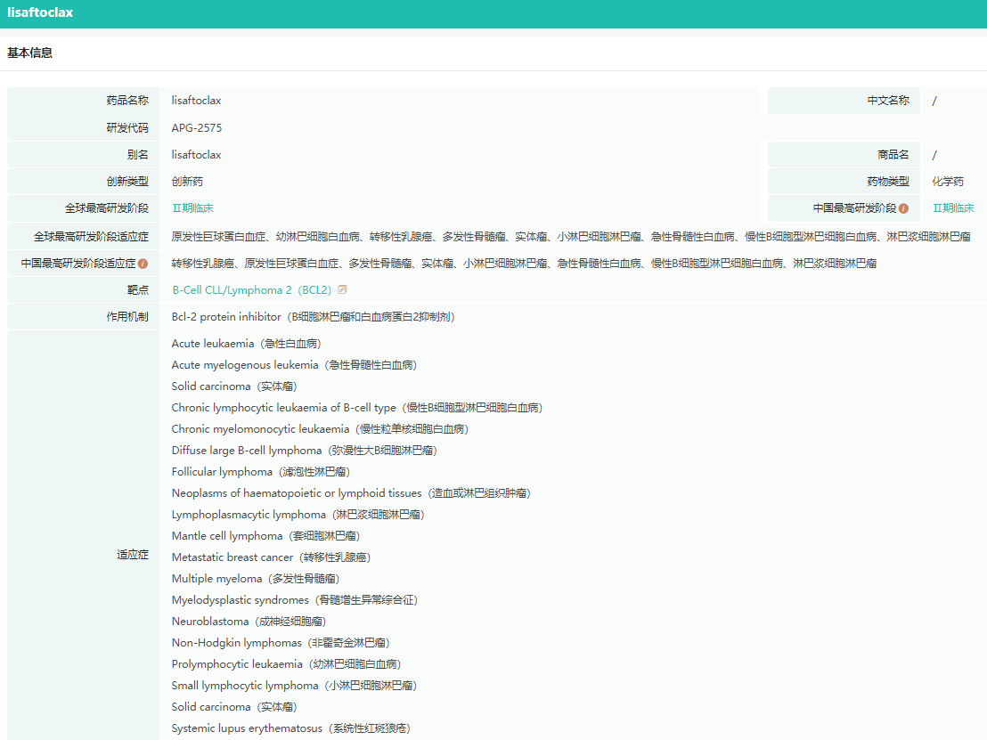 8 月 7 日,亚盛医药宣布,美国 FDA 已同意其核心产品 Bcl-2 选择性抑制剂 lisaftoclax(APG-2575)开展一项全球关键注册性 3 期临床研究,用于治疗既往接受治疗的慢性淋巴细胞白血病(CLL)/小淋巴细胞淋巴瘤(SLL)患者。