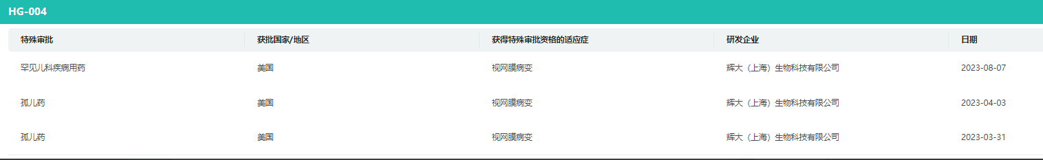 据药融云数据库显示,HG004 已先后在美国和中国获批临床,将开展中国国际多区域、多中心同一主方案的基因治疗药物临床试验。该药还获得了 FDA 孤儿药资格,用于治疗由 RPE65 突变引起的遗传性视网膜疾病。
