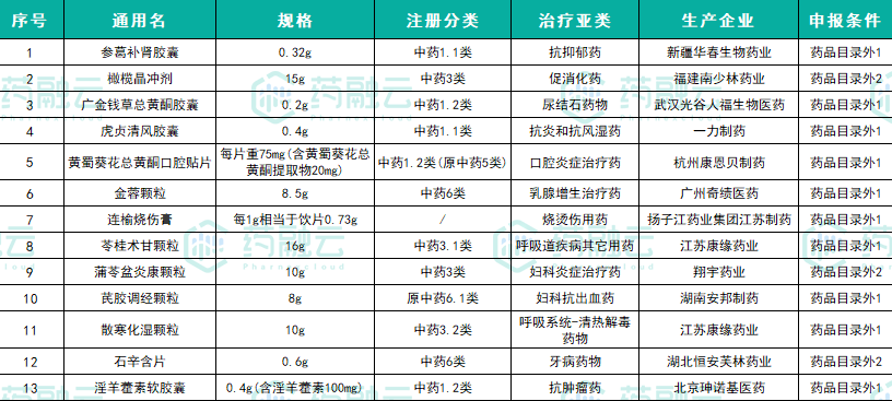 在《通过初步形式审查的目录外药品名单》中,有13个中成药独家品种通过初步形式审查,包括华春生物的参葛补肾胶囊、南少林药业的橄榄晶冲剂、人福医药的广金钱草总黄酮胶囊、一力制药的虎贞清风胶囊、康恩贝制药的黄蜀葵花总黄酮口腔贴片、扬子江药业的连榆烧伤膏、康缘药业的苓桂术甘颗粒等。