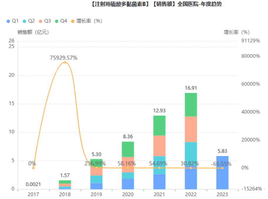 由于近年来抗菌药物的耐药问题频现,该品种又重新回到临床被广泛应用,市场异军突起,院内销售额从2018年的1.57亿元增长至2022年的近17亿元,复合增长率达82.3%;今年第一季度以40%的增长率稳定扩容中。