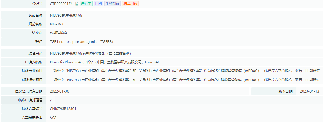 在结束其开发之前,诺华正在进行NIS793针对转移性胰腺导管腺癌(mPDAC)一线治疗的大规模临床III期试验(CTR20220174),在一线环境中测试该候选药物与吉西他滨和白蛋白结合型紫杉醇的组合,该药物曾有望成为较具潜力的mPDAC治疗策略。