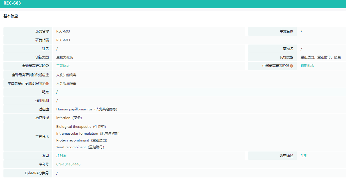 我们正在进行REC603中国III期临床试验。该试验由主效力试验、小年龄组免疫桥接试验、与Gardasil®9免疫原性比较试验三部分组成,采用多中心、随机、盲态、安慰剂对照设计,受试者总样本量为16,050例。