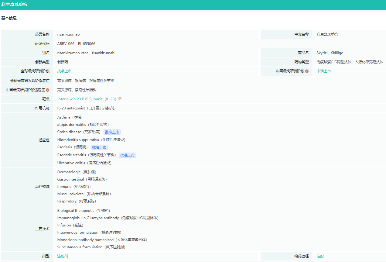 Risankizumab是一种人源化、IgG1亚型的单克隆抗体,可以借由与IL-23的p19亚基结合而选择性地拮抗IL-23。IL-23是一种与炎症有关的细胞因子,被认为与许多慢性免疫疾病有关。目前,Skyrizi已获得3项FDA批准的适应症,包括克罗恩病、中重度斑块状银屑病,以及成人活跃银屑病关节炎。