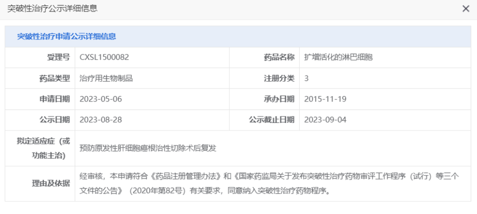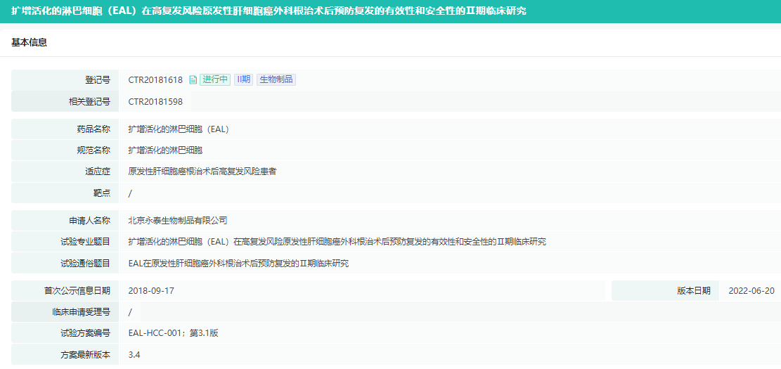 8月28日,CDE官网显示,永泰生物扩增活化的淋巴细胞(EAL)拟纳入突破性疗法,用来预防原发性肝细胞癌根治性切除术后复发。
