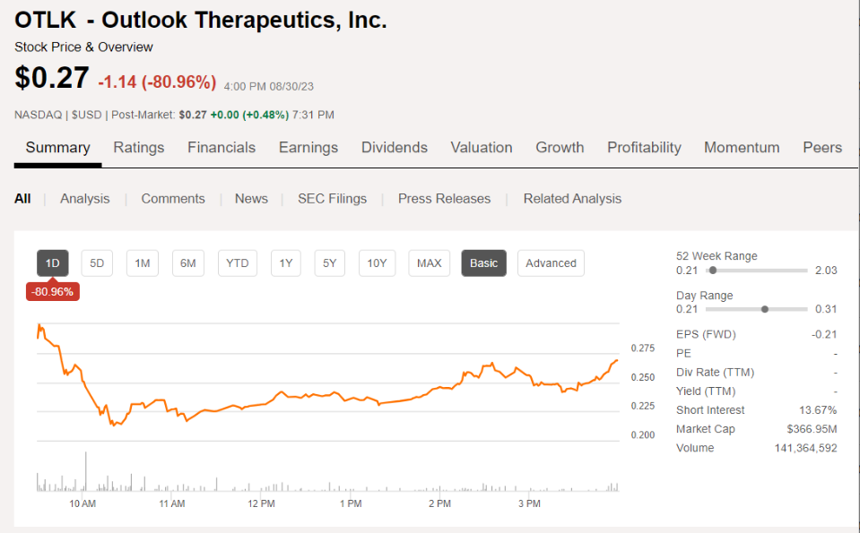 受此影响,Outlook Therapeutics股价大跌80%,目前市值为3.67亿美元。