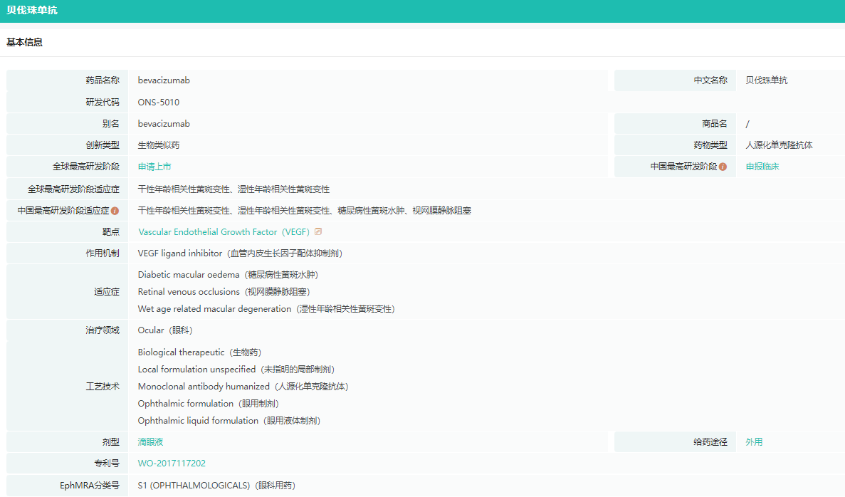 ONS-5010(Lytenava)是一款在研贝伐珠单抗眼用制剂,用于治疗湿性AMD和其他视网膜疾病,通过玻璃体内注射给药,从而减少内皮细胞增殖、血管渗漏和视网膜新血管形成达到治疗作用。