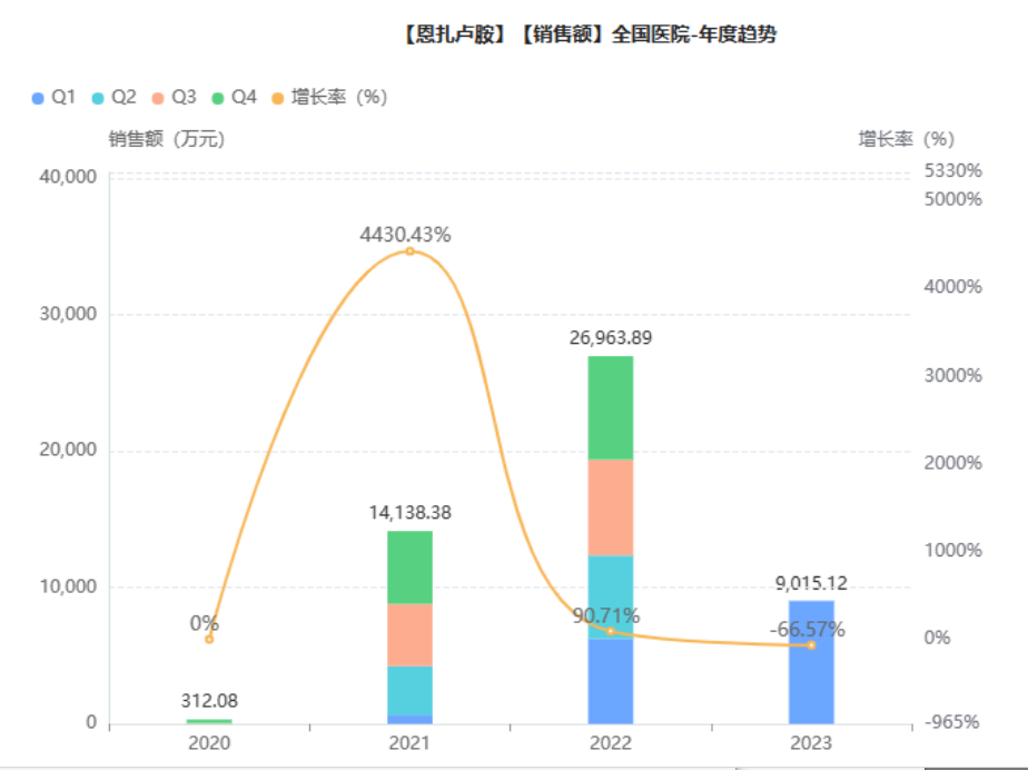 2020年恩扎卢胺通过国家医保谈判降价78%进入医保乙类目录,挂网价为69.6元(40mg),其市场也被快速打开。2021年院内销售额便已突破亿元大关;2022年达2.7亿元,同比增长90%。