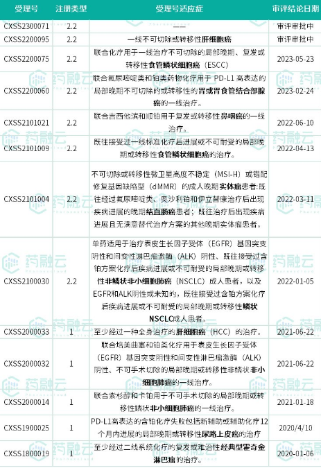 据药融云数据库,替雷利珠单抗注射液已在国内陆续获批11项适应症,包括食管鳞状细胞癌、胃或食管结合部腺癌、鼻咽癌、结直肠癌、非小细胞肺癌、霍奇金淋巴瘤等,其中,联合化疗用于一线治疗不可切除的局部晚期、复发或转移性食管鳞状细胞癌(ESCC)的适应症于今年5月获批。