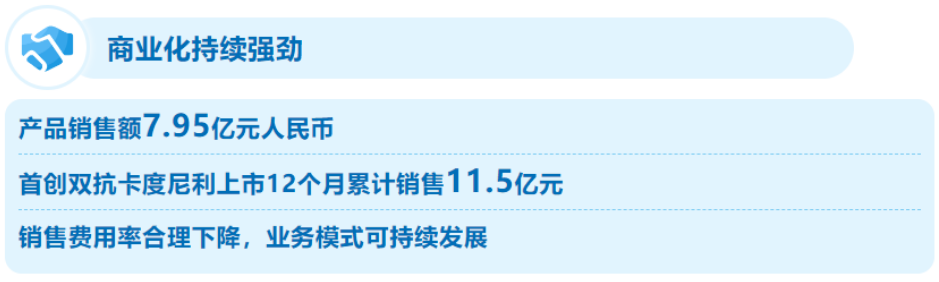 于 2022 年 6 月获批上市的 PD–1/CTLA–4 双抗卡度尼利单抗,上半年销售额为 6.058 亿元。上市12个月以来,卡度尼利累计实现产品销售11.5亿元,超额完成此前上市首年销售10亿元的业绩目标,主要得益于卡度尼利优异的临床价值和公司差异化的商业化能力。