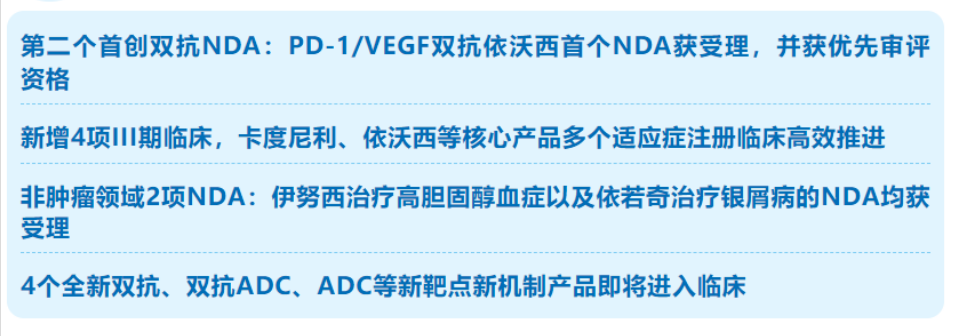 继全球首个获批上市的肿瘤免疫双抗卡度尼利之后,2023年8月,公司另一自主研发的全球首创PD-1/VEGF双抗依沃西的NDA已经被国家药品监督管理局药品审评中心(NMPA CDE)受理,并获优先审评资格,有望成为全球第一个上市的肿瘤免疫+抗血管双抗,进一步夯实康方生物双抗药物开发全球地位。