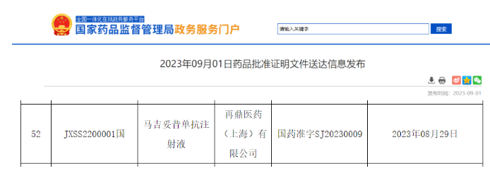 9月1日,NMPA官网显示,再鼎医药的HER2单抗马吉妥昔(Margenza)获批上市,用于联合化疗治疗已经接受过两种或两种以上抗HER2治疗方案的转移性HER2阳性乳腺癌成人患者,其中至少一种治疗方案用于转移乳腺癌。(受理号:JXSS2200001)