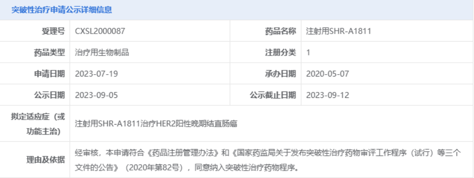 今日,恒瑞医药创新药SHR-A1811被国家药品监督管理局药品审评中心拟纳入突破性治疗品种公示名单,用于治疗HER2阳性晚期结直肠癌。