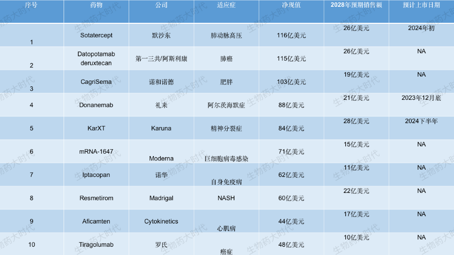 以下十大最有价值的项目的净现值为791亿美元,到2028年,全球潜在产品总收入将达到194亿美元。
