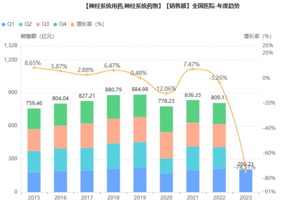 据药融云数据库统计,中国神经系统用药院内市场销售额峰值超880亿元,近两年有所下滑,2022年院内销售额为809亿元,为整体医药市场热门领域。其中恩华药业为TOP3药企,仅次于扬子江和宜昌人福药业。